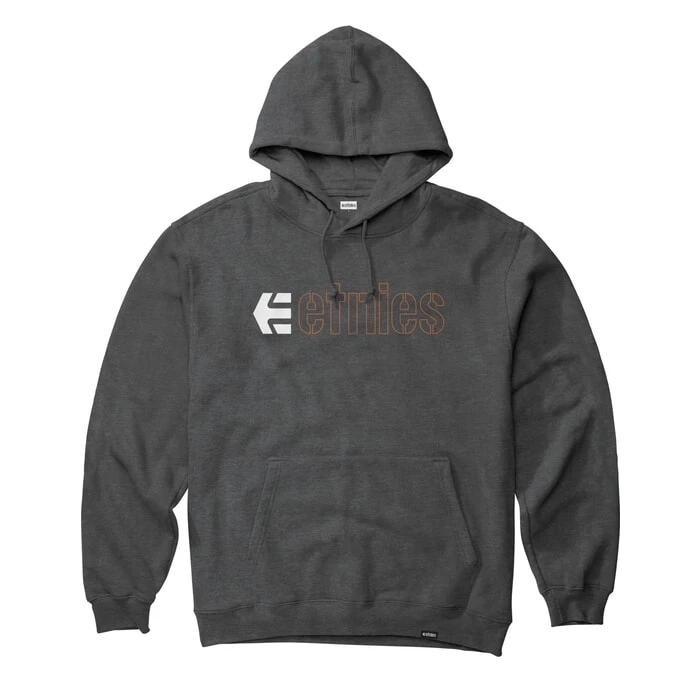 Etnies Ecorp regular fit pullover hoody in charcoal/heather features a adjustable drawstring hood and pouch pocket. Branding includes a Etnies logo chest print and Etnies woven label. Made from 80% cotton and 20% polyester.