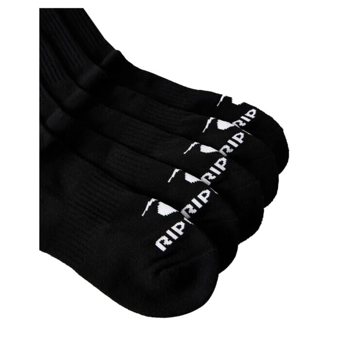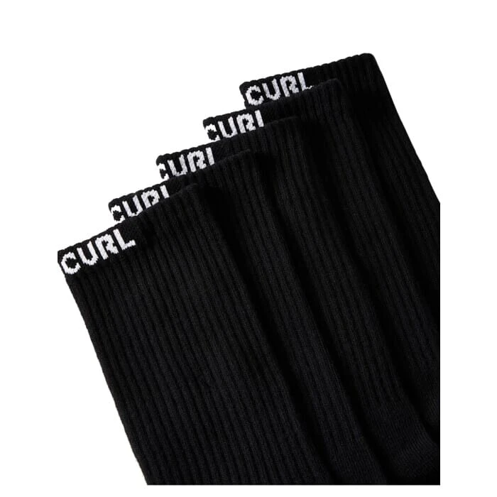 Rip Curl Brand Crew Sock 5-Pk uk 8 – 12 crew socks in black features a arch support and terry loop cushioning. Branding includes a Rip Curl embroidered logo. Made from 80% cotton – 16% polyester and 4% elastane.