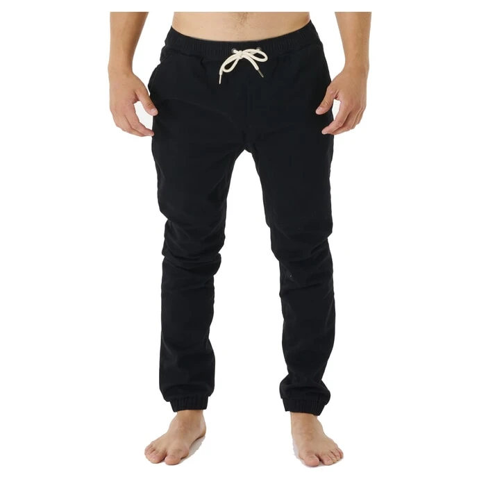 Rip Curl Re Entry Jogger regular fit trousers in black features 5 pockets and elastic cuffs as well as elasticated waist. Branding includes a Rip Curl woven label. Made with stretch material. Made from 98% cotton and 2% elastane.