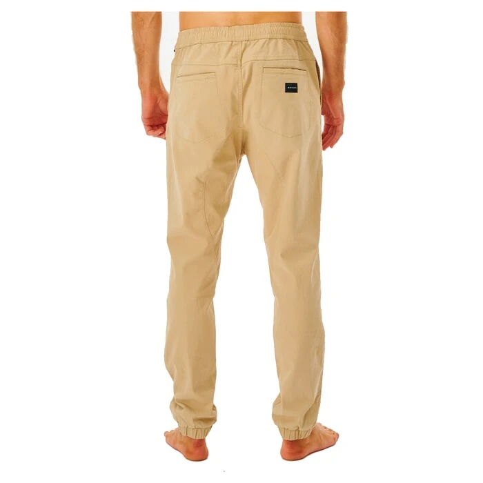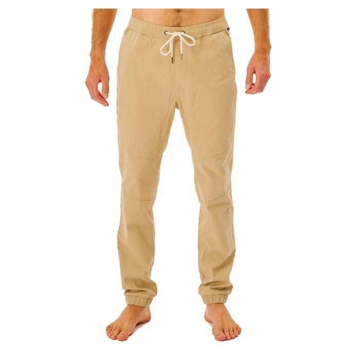 Rip Curl Re Entry Jogger regular fit trousers in khaki features 5 pockets and elastic cuffs as well as elasticated waist. Branding includes a Rip Curl woven label. Made with stretch material. Made from 98% cotton and 2% elastane.