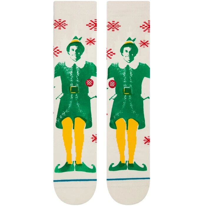 Stance Buddy The Elf Elf Christmas crew casual socks in off white features Stance Infiknit. Also features a arch support and medium cushioning. Branding includes a Stance embroidered logo. Made from 59% cotton – 2% elastane – 17% nylon and 22% polyester.